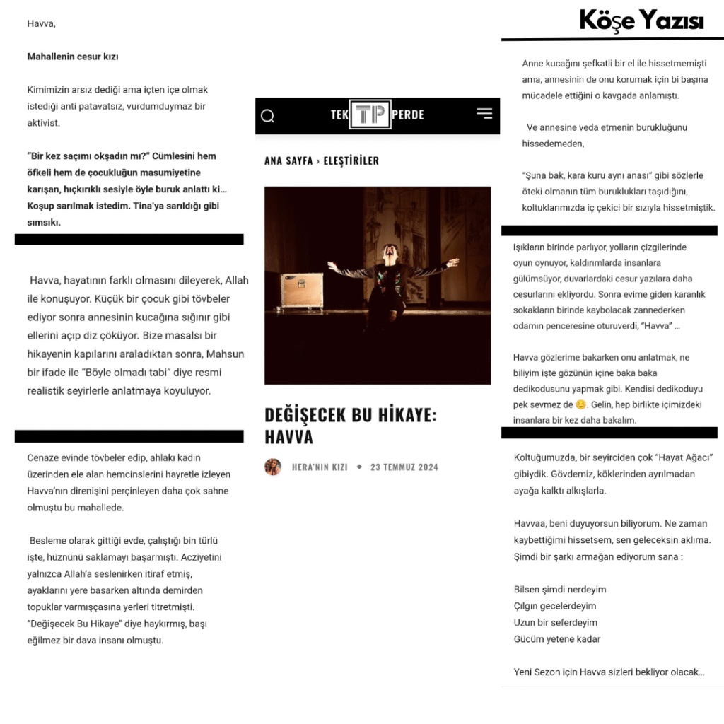 Dişiyle,tırnağıyla,sesiyle, kalbiyle bi “Havva” vardı sahnede!Rejisinden müziklerine kadar hiç unutulmayacak birsey vardı izlerken!Tiyatrodan uzaklaştığım anda tekrar içime “izleme” hevesi geldi!Uzun yıllar sonra harika bi oyun izledim ve kendimi salonda değil, hikayenin tam ortasında buldum.Ayakta alkışlıyorum!