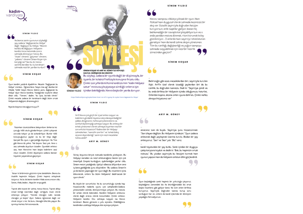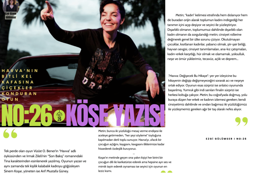 Sahneden “Değişecek Bu Hikaye” diye çıkıyoruz. Oyun, Vüs’at O. Bener’in “Havva” adlı öyküsünden ve Irmak Zileli’nin Son Bakış adlı romanındaki “Tina” karakterinden esinlenerek, Sinem Koşar tarafından tekrar yazılıyor. Havva (“O Havva değil haşa”) içinde bulunduğumuz bu çağın, tüm bu zorluklarına karşı mücadele etmeyi, direnmeyi ve dönüşmeyi güçlü bir şekilde ele alıyor. Cinsiyet eşitsizliği gibi, toplumsal şiddet gibi konular karşısında bireyin başlattığı başkaldırı, kolektif bir çağrıya dönüşüyor. Sayısız kadının ortak sesi gibi. Sinem Koşar’ın tek kişilik performansı oldukça etkileyici ve samimi. Sahneye girdiğimiz ilk anda hemen bizi karşılıyor. Mekana olan hakimiyeti, yüksek enerjisi sadece Havva’nın değil onunla gelen tüm hayatları, bizi sahneye taşıyor. Hikayesinin duygusal yoğunluğu katlanarak tüm sahneyi kaplıyor. Oyundaki etkili ışık, ses ve minimal dekoru kullanımı, hikayenin önüne geçmeyen bir odaklanma imkanı sağlıyor. Hayatla mücadele eden Havva, seyirciye kurduğu iletişimle bizleri de olanlara bir tanık, hatta en önemlisi ortak haline getiriyor. Onunla yürümek, değişecek bu hikaye demek, artık biz varız demek.